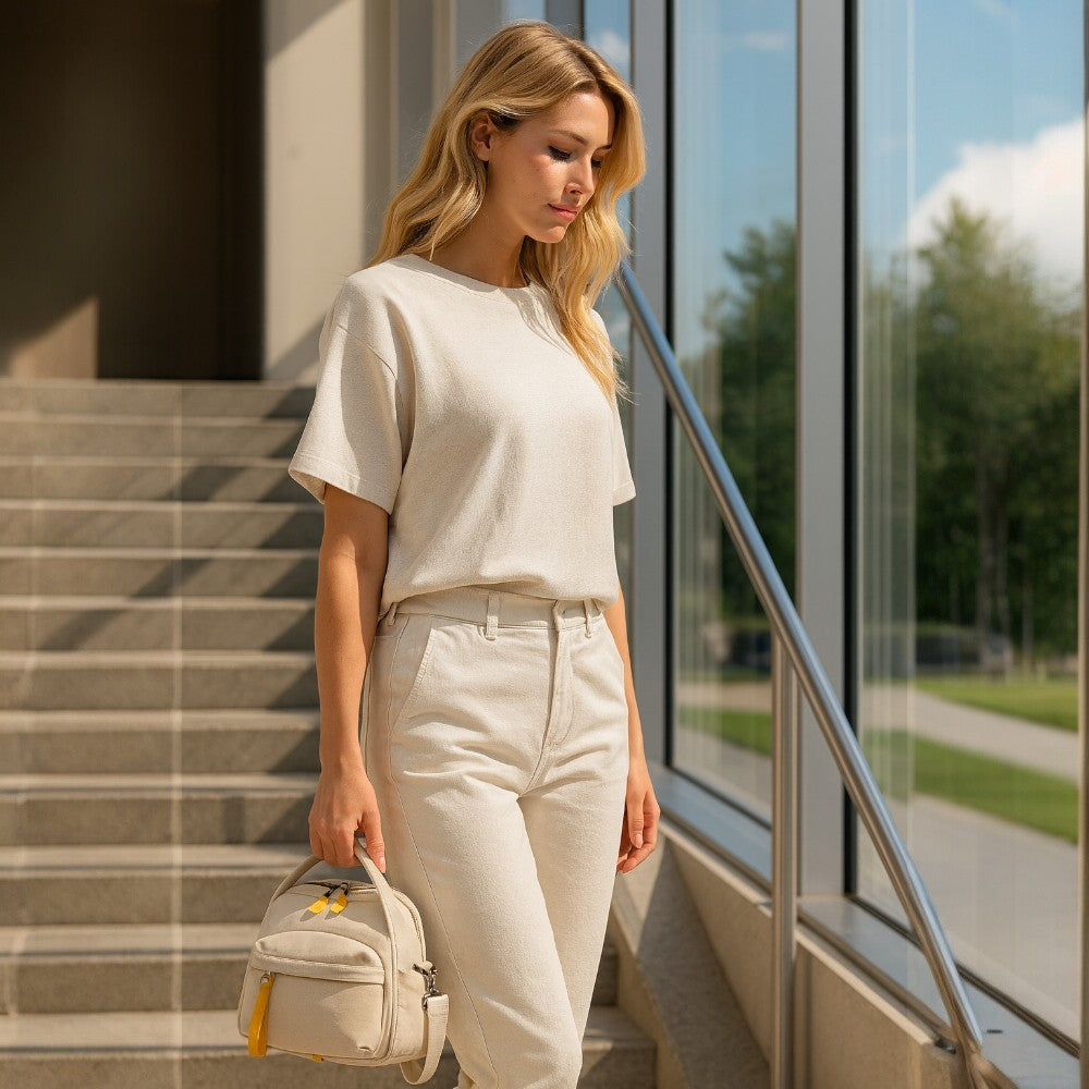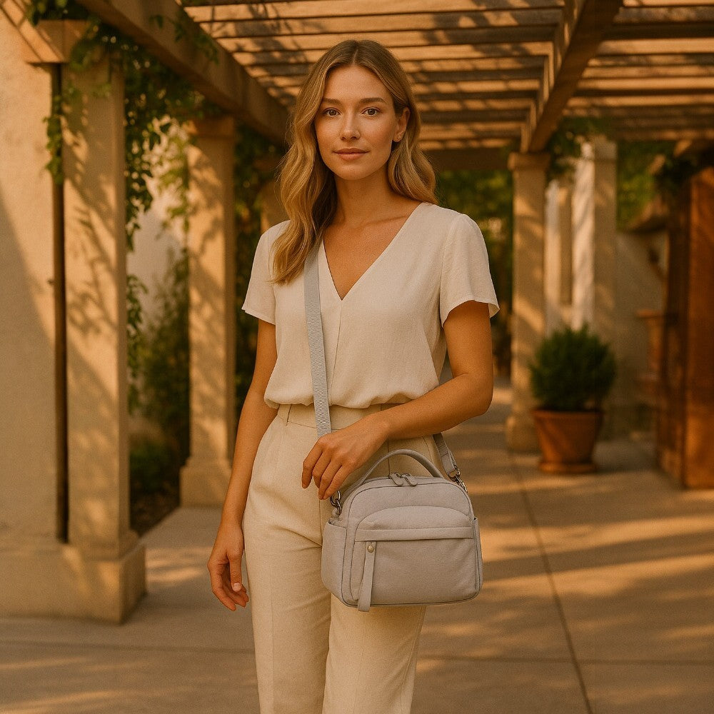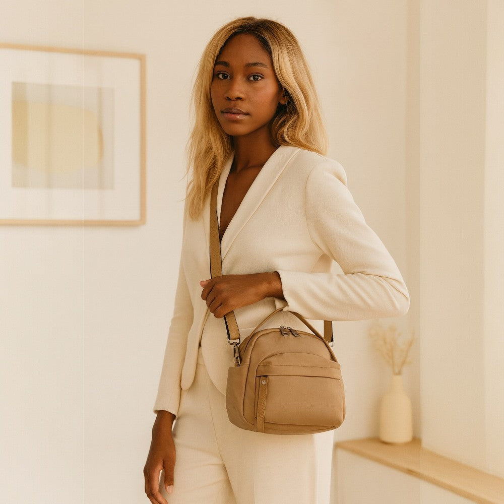 With its soft lines and rounded shape, Lyona adds a chic touch to every outfit. Lightweight, soft to the touch and water-resistant, it keeps your essentials organized..
