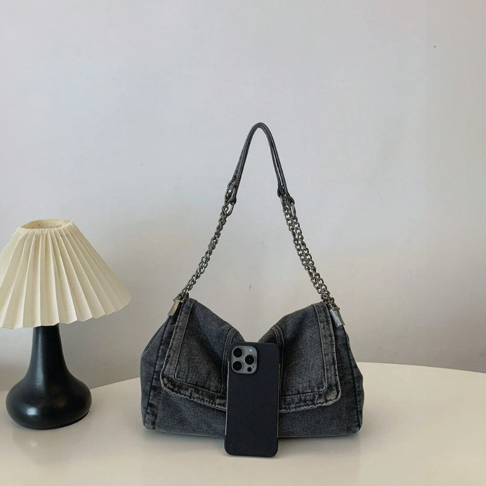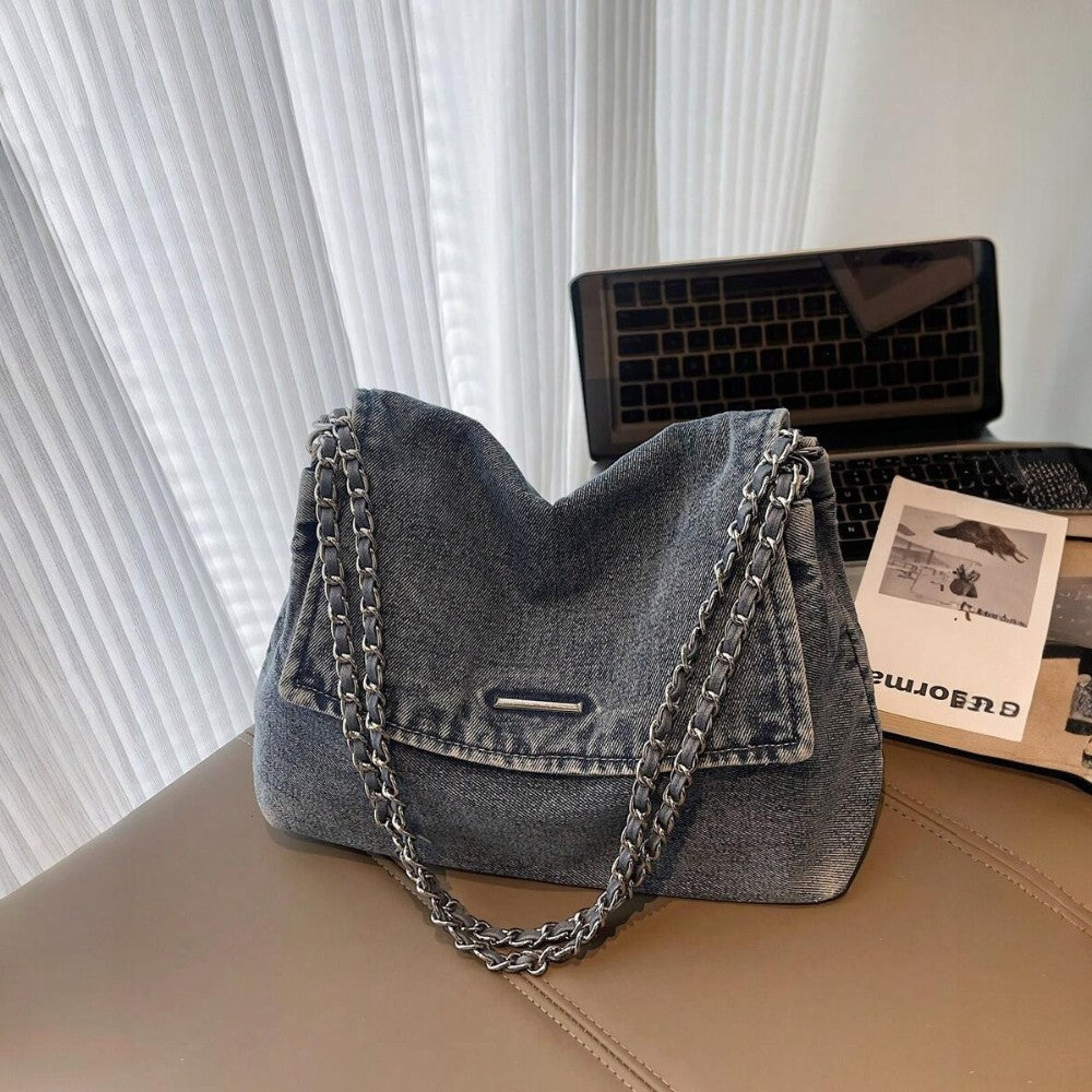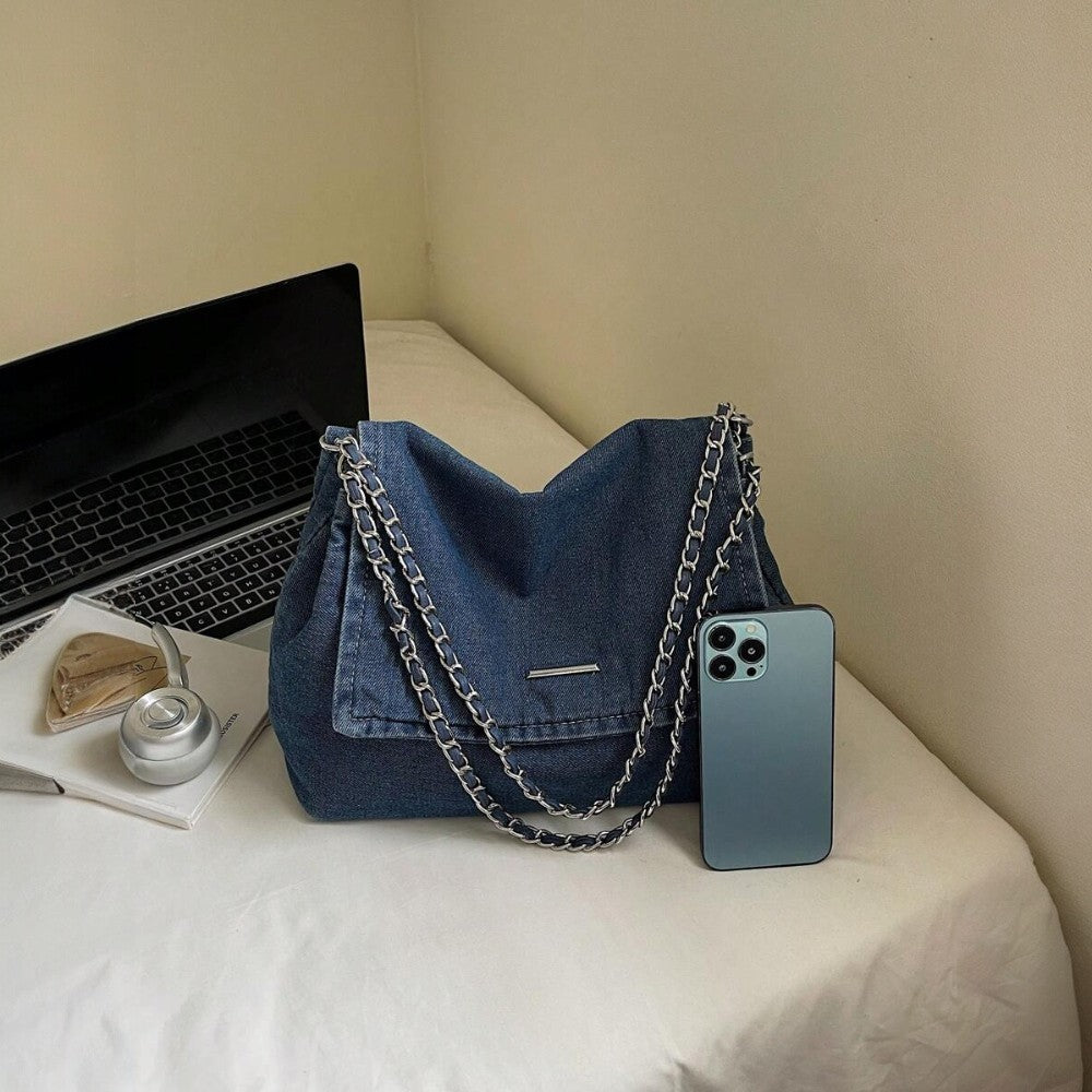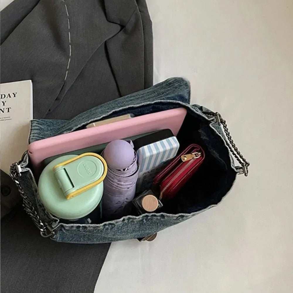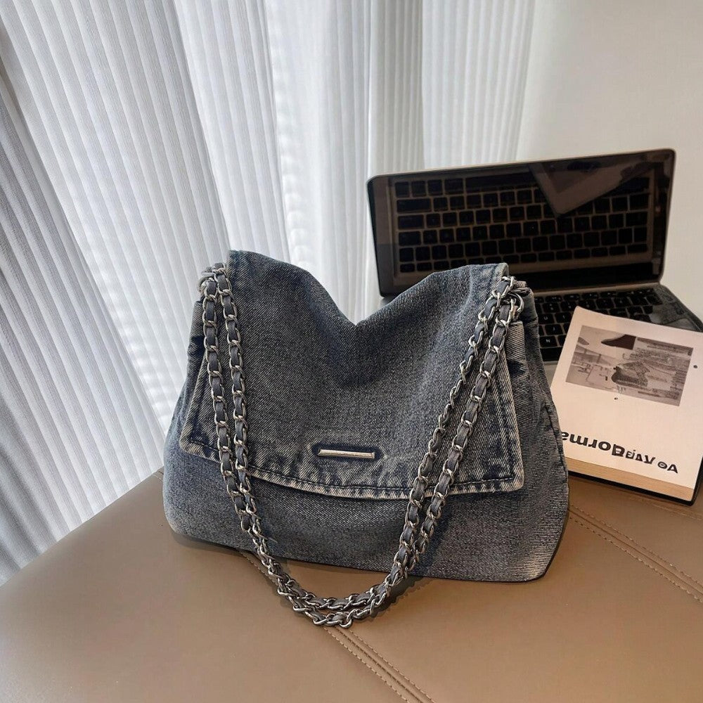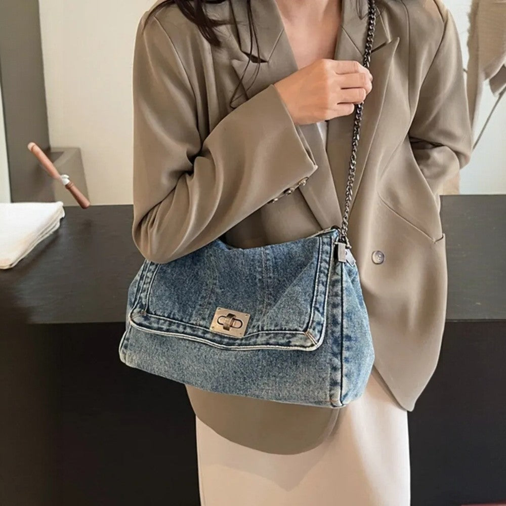 Our Grace bag is made from high-quality denim, combining casual style with durability. Designed to be roomy enough, it easily accommodates your essentials: laptop, make-up and everyday accessories.